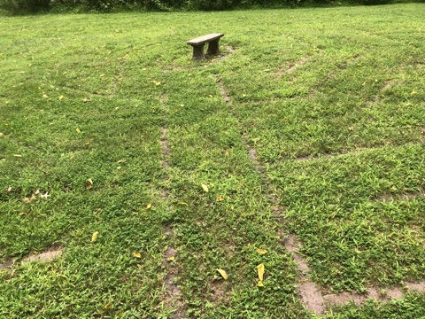 The labyrinth itself is a seven-circuit, Chartres-style labyrinth. The path is grass, and the walls are bricks inlaid into the grass. It seems to me that this sort of labyrinth requires very simple maintenance — just mowing. Yet if the grass grows too much, it can be hard sometimes to see the walls. These can be challenging to walk, which is no criticism — it requires paying attention.