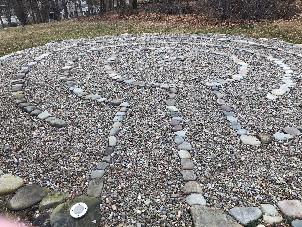 I parked in the designated spot. I walked up the stairs into their backyard, and stood at the threshold of the labyrinth they’d so lovingly made. It was a three-circuit classical design, with small stones for the path, and fist-sized rocks for the walls.