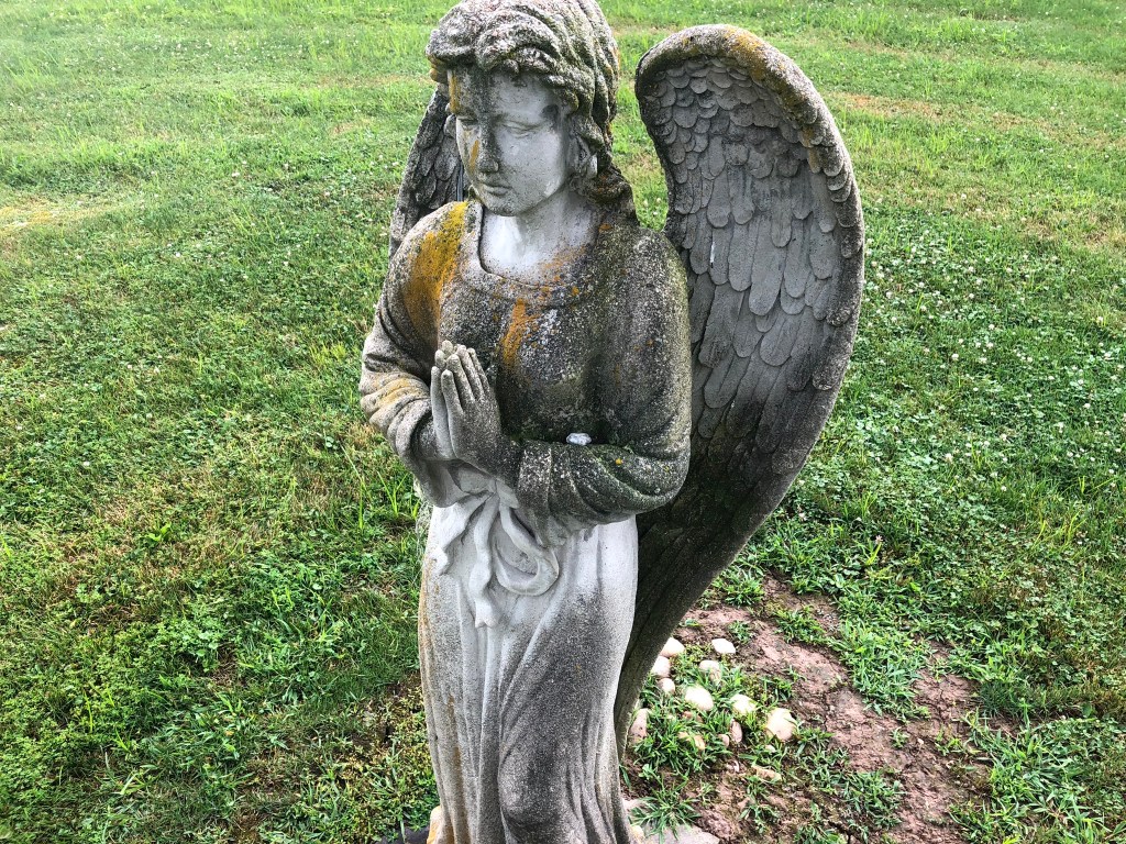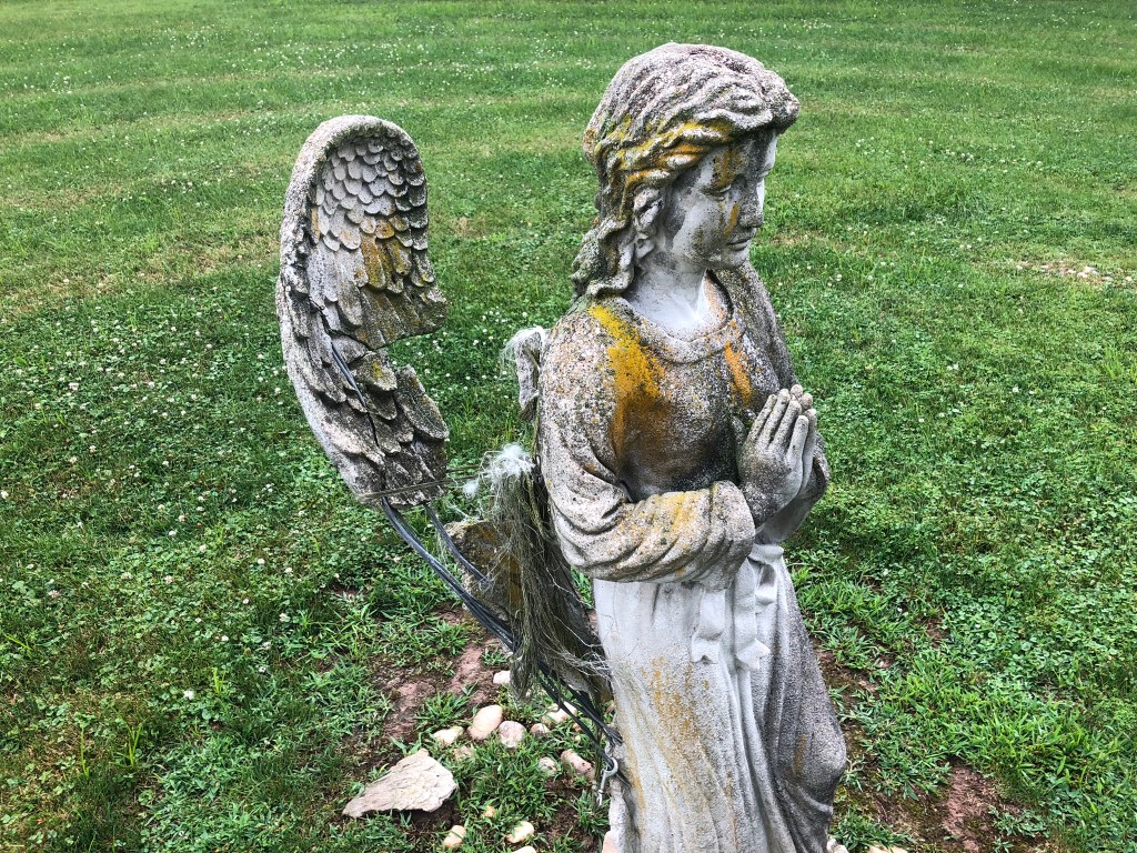As I walked, I lost the path very quickly. I could not see for the life of my where it was. I saw inklings of it, echoes and traces. So I gave up on trying to see it, and instead just walked around in a big spiral, slowly working my way inward to the statue. When I reached the center, I stood and stared at the angel. I was awestruck by her beauty. After staring for a while, I finally noticed that her right wing was seriously broken, completely detached from her body. But it was held to the statue with cables and ropes and love. I thought about my struggle to get to this labyrinths – two consecutive strike-outs, a heavy rainstorm, almost giving up on finding this one, and then the challenge to walk the labyrinth. I thought about how wet my feet had gotten. How broken this angel’s wings were. And yet how beautiful she is.