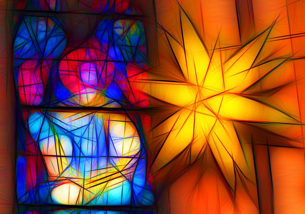 The caption “Christmas in a church” is embedded in the image file, and that gives a clue to what this really is a picture of. Note that this full image has more on all four sides, and what is revealed there showed me that this is a stylized and modified image of the inside of a church at Christmas: the left side is a stained glass window, almost certainly of Mary holding the infant Jesus. I can see the wood of the window frame clearly, and the orange background on the right side seems to be a wooden wall that continues past the window. Hanging from above is a Moravian star, likely lit from within. The artist framed the image such that the window and the star formed a beautiful balance.