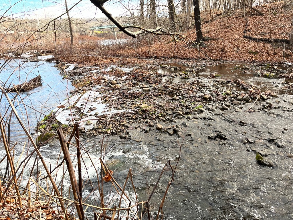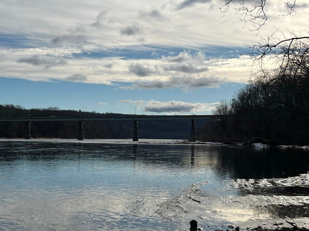 And this morning I went out again. I wanted to see where the water was here in my current area. I’ve lived here ten years, and I haven’t spent the kind of time in the woods nearby as I did as a child. I thought about Lake Minsi just up the road, the East Bangor Dam a little ways the other way. I ended up driving five miles to the Portland-Columbia Pedestrian Bridge over the Delaware River. I thought I would stand in the middle of the bridge and just look out, see how it felt to me. I found something much better. Right at the bridge was a trail down to the river. There was a wonderful area along the bank of the river, stretching for a few hundred yards down to where the Jacoby Creek enters the river. It was mostly wild, but there was an easy trail to follow, even with a bench, a trash can, and a few signs prohibiting alcohol (a rule I could easily tell was flouted). I loved it. It felt so right, stomping around in the leftover snow, sliding a bit on the leftover ice, finding my way around and listening to the water flowing and flowing. This is a place that just felt right.