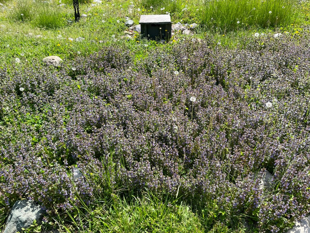 This is a seven-circuit classical labyrinth in a large field at the Orchard Hill Center. The path is simply grass, and the walls are various rocks; I would guess they were found locally. The labyrinth was kind of a mess the day I walked it, though. The field around it was mown, so somebody was responsible for caretaking. But the labyrinth was unkempt. Weeds and wildflowers grew wild in it. Loads of dandelions, crab grass, and more. It took me a few moments to find the entrance, because a huge section was covered with a purple-grey-flowered ground cover.