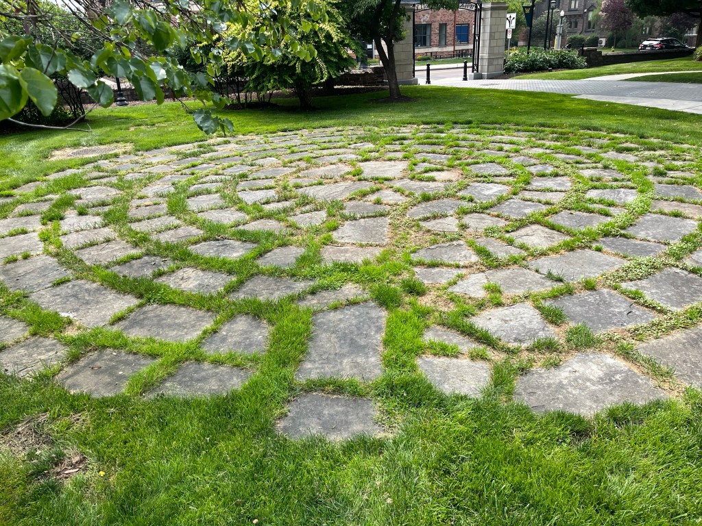 Finally I reached the labyrinth. It’s interesting. It’s a six-circuit classical, with large paving stones for the path, and grass walls. At first glance, it was hard to tell it was a labyrinth. It just looked like concentric circles. The turns in the path are very subtle, and I wonder if I might have had trouble walking it if I didn’t have as much experience with labyrinths as I do.