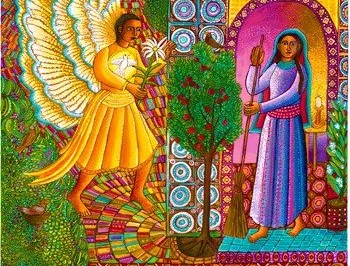 So I got up and wandered over to the conference room, where our Thursday morning coffee hour group was meeting. This is a group of women who meet weekly for fellowship, prayer, and study. I found that this week they were looking at an image of a particular art print, Annunciation by John Swanson. It told the story of the angel Gabriel coming to Mary, the mother of Jesus, to tell her she would bear the Son of God. As soon as I saw the image, I was sucked in immediately.