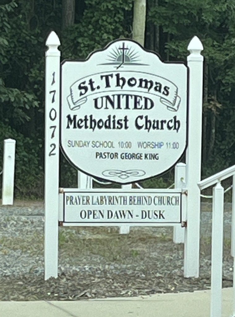 My first stop was at St. Thomas United Methodist Church in Bloxom, Virginia. The labyrinth was in the church’s expansive backyard. It’s a 7-circuit medieval style, with a grass path and inlaid stone walls.